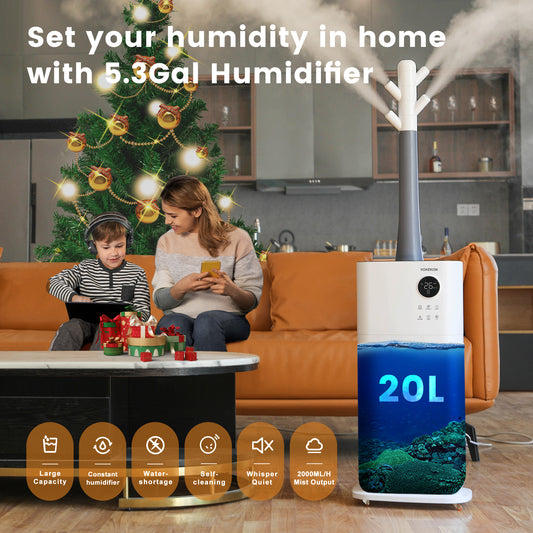 [BH-2118]Humidifiers for Home Large Room-YOKEKON 2000 sq ft, 5.3Gal/20L Large Cool Mist Humidifiers for Whole House, Greenhouse, Commercial Branch Tube Design with 360° Nozzle Sets, Remote, White
